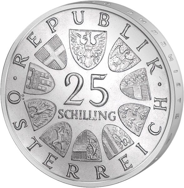 25 Schilling I. Forma - váha 13g (obsah stříbra 10,4g), ryzost 800/1000, ražba 1955-1973, průměr mince 30mm.