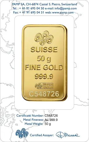 Švýcarské zlaté slitky z 24 karátového zlata, certifikované švýcarskou rafinérií PAMP odpovídají londýnskému standardu Good Delivery (LBMA) a jsou proto bez problémů akceptovány na všech světových trzích.